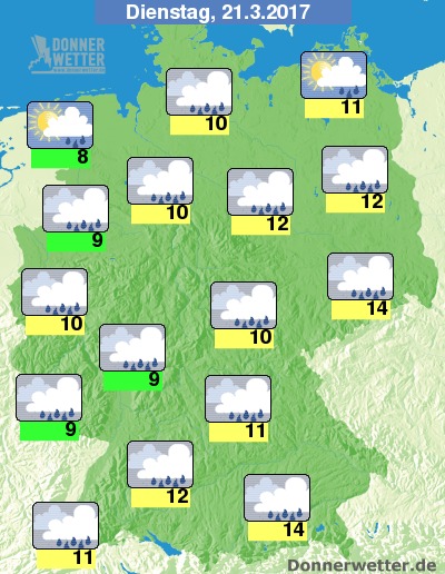 Heute zeigt sich der Himmel über Deutschland verbreitet stark, nur hier und da auch mal etwas aufgelockert bewölkt, es bilden sich wiederholt Schauer. Ab den Nachmittagsstunden klingen die Niederschläge im Nordwesten ab und oft heitert es dann auch auf. Die Temperatur steigt auf 8 Grad in Emden und bis 14 Grad in Görlitz.