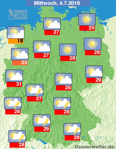 Am Mittwoch ist es im Süden teils heiter, zum Teil ziehen aber auch einige Quellwolken auf, dabei sind lokale Schauer und Gewitter möglich. Im übrigen Bundesgebiet bleibt es hingegen meist heiter bis sonnig und dabei auch trocken. Die Temperatur steigt auf eher kühle 18 Grad an der Nordseeküste und bis 31 Grad in der Kölner Bucht.