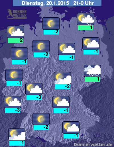 In der Nacht zum Mittwoch klingen die Schneefälle im Nordosten und Osten Deutschlands ab und die Bewölkung kann auch hier zeitweise auflockern. Sonst ist es bereits meist locker oder aufgelockert bewölkt, vor allem in der Westhälfte zu Beginn noch häufig sternenklar, und es bleibt trocken. Nur im äußeresten Südwesten können sich im Laufe der Nacht bei teils dichten Wolken einzelne Schneefälle entwickeln. Stellenweise bildet sich Nebel oder Hochnebel. Die Tiefstwerte liegen bei 1 Grad an der Nordseeküste und bis -4 Grad im Coburger Land.