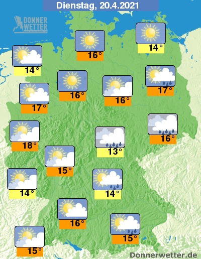 Am Dienstag zeigt sich das Wetter im Norden heiter bis sonnig und trocken, im übrigen Bundesgebiet ist es teils heiter, teils ziehen dichte Wolken durch, dabei sind örtliche Schauer und vereinzelt auch Gewitter möglich. Die Temperatur steigt auf 13 Grad im Eichsfeld und bis 18 Grad im Rheinland.