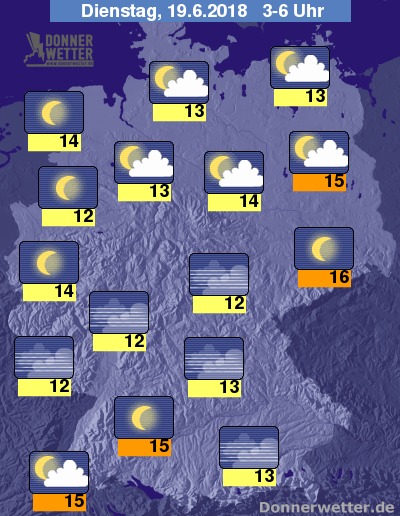 In der Nacht zum Dienstag ist es über dem Norden zumeist locker, teils wechselnd bewölkt. Im übrigen Land ist es sogar verbreitet sternenklar und es ziehen nur hier und da mehr Wolken durch, dazu bleibt es landesweit trocken. Die Temperatur sinkt auf 16 Grad in Dresden und bis 12 Grad im Saargau.