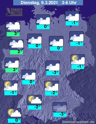 Die Temperaturen sinken auf Werte um 3 Grad im Rheinland und um -3 Grad im Alpenvorland.