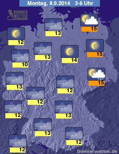 In der Nacht zum Montag sind anfangs im äußeren Osten noch ein paar Schauer und Gewitter unterwegs, sonst klingen die Schauer und Gewitter aber nach und nach weiter ab und nachfolgend bleibt es trocken. Es ist verbreitet nur locker bewölkt oder sternenklar. Es bildet sich jedoch örtlich Nebel. Die Temperatur sinkt bis zum Morgen auf 15 Grad in Berlin und 10 Grad am Niederrhein.