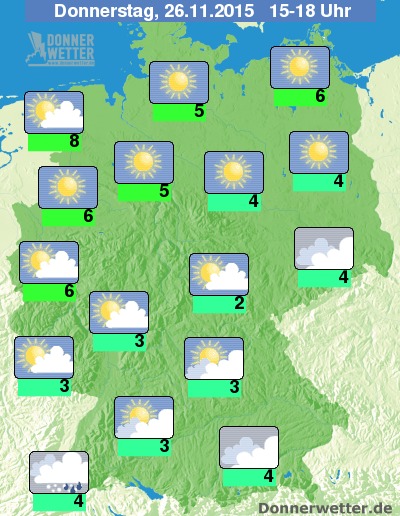 Heute Nachmittag strahlt besonders über Norddeutschland verbreitet die Sonne bei meist nur wenigen oder garkeinen Wolken, aber auch über dem Westen und der Mitte des Landes ist es oft nur locker bewölkt. Südlich eines breiten Streifens vom Schwarzwald bis nach Sachsen ist es oft stark, teils aber auch aufgelockert bewölkt, bevorzugt am Alpenrand und regional auch im übrigen Süden des Landes fällt zeitweise Schnee oder Schneeregen, dabei besteht Glättegefahr! Sonst ist es jedoch verbreitet trocken. Die Temperatur steigt auf 2 Grad am Steigerwald und bis 8 Grad an der Wesermündung.
