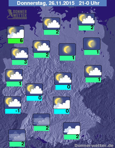 Heute Abend ist am Alpenrand bei oft dichten Wolken noch etwas Schnee möglich, sonst ist es von der Mitte des Landes bis nach Ostdeutschland hinein meist sternenklar, im übrigen Bundesgebiet zieht meist lockere bis aufgelockerte, teils auch starke Bewölkung durch, dazu bleibt es trocken. Die Abendtemperatur liegt bei 6 Grad im Ammerland und um -1 Grad im Saargau.