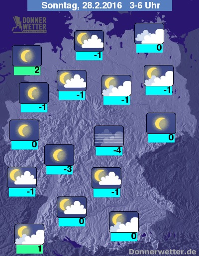 In der kommenden Nacht bleibt es über der breiten Mitte sowie im Nordwesten des Landes meist sternenklar. Nach Süden und Nordosten hält sich dagegen meist starke Bewölkung, jedoch bleibt es auch hier trocken. Die Temperatur sinkt auf 2 Grad in Ostfriesland und bis etwa -4 Grad in Unterfranken.