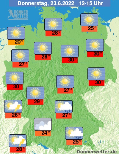 Im Süden oft schwülwarm mit Gewittergefahr.