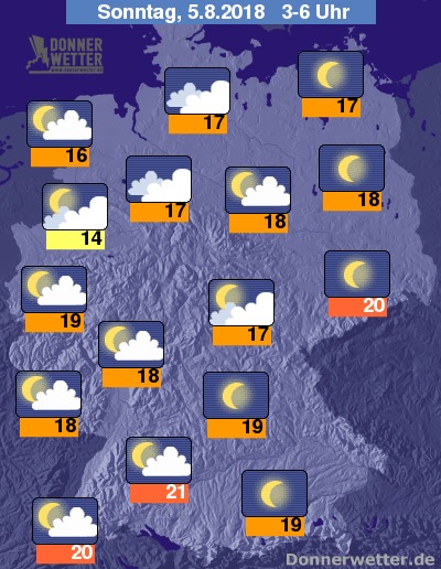 In der kommenden Nacht ist es zum Großteil locker bewölkt bis sternenklar, zum Teil sind aber auch dichte Wolken möglich, dazu bleibt es aber weitgehend trocken. Die Temperatur sinkt auf 21 Grad im Raum Stuttgart und bis 14 Grad im Münsterland.