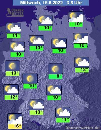 In der folgenden Nacht ist der Himmel zumeist locker, teils auch wechselnd bewölkt. Vor allem über der breiten Landesmitte, aber auch im Süden ist es oft auch sternenklar. Es bleibt trocken bei Tiefstwerten von 16 Grad in Freiburg und 8 Grad in Jena.