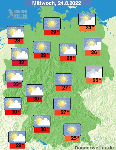 Am Mittwoch zeigt sich das Wetter heiter bis sonnig, im äußeren Osten ziehen zum Teil dichte Wolken durch und es bilden sich lokale Schauer. Im übrigen Land bleibt es trocken bei 24 Grad auf Rügen und bis 33 Grad in der Kölner Bucht.