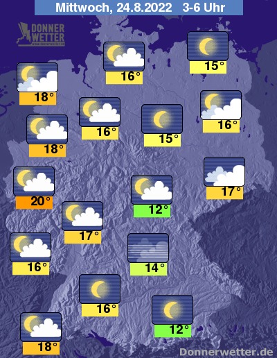 In der folgenden Nacht ist der Himmel überwiegend locker bewölkt oder sternenklar, dazu bleibt es trocken. Die Temperatur sinkt auf tropische 20 Grad in Köln und bis 12 Grad in München.