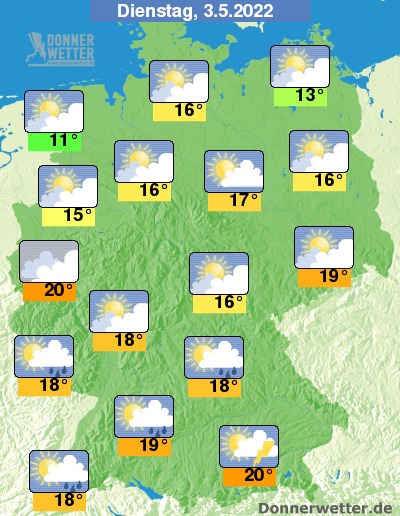 Am Dienstag zeigt sich das Wetter im Süden teilweise heiter, teils ziehen hier jedoch dichte Wolken durch, dabei bilden sich einzelne Schauer, lokal auch Gewitter. Im übrigen Land ist es meist heiter, teils aber auch stark bewölkt, dabei bleibt es weitgehend trocken. Die Temperatur steigt auf 11 Grad in Bremerhaven und bis 20 Grad in München.