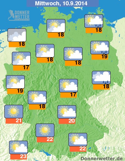 Heute beginnt der Tag verbreitet freundlich und trocken, im Ostseeumfeld und am Alpenrand können sich hingegen schon früh einzelne Schauer und auch Gewitter entwickeln. Zum Nachmittag und Abend hin breiten sich die Schauer von Nordosten her auch bis zur Elbe und bis nach Sachsen hin aus, sonst bleibt es aber vielfach heiter bis wolkig und trocken. Die Temperatur steigt auf 17 Grad im Münsterland und bis spätsommerliche 23 Grad im Breisgau.