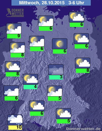 In der Nacht zum Mitwoch bleibt der Himmel meist locker oder aufgelockert bewölkt, vor allem in der Mitte und im Osten des Landes zeigt sich gebietsweise ein sternenklarer Nachthimmel. Im Südwesten werden die Wolken zunehmend dichter und gegen Morgen ist hier und da auch etwas Regen möglich, sonst bleibt es jedoch trocken. Die Tiefstwerte liegen bei 10 Grad in Freiburg und bis 3 Grad im Eichsfeld.
