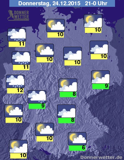 Am heutigen Heiligen Abend ziehen im Westen und Nordwesten und im weiteren Verlauf auch im Norden des Landes dichte Wolken und nachfolgend auch Regen auf, in den übrigen Landesteilen bleibt es hingegen zumeist noch aufgelockert, zum Teil auch locker bewölkt und dabei trocken. Die Abendwerte liegen bei 12 Grad in Köln und etwa 6 Grad in München. Im Norden weht teils starker, an der Ostsee teils stürmischer Wind, an der Nordsee herrscht oft Sturm, dabei sind auch orkanartige Böen möglich.