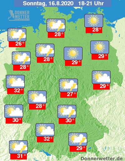 Heute Abend ist es über dem Nordosten weitgehend sonnig und trocken. Meist heiter bis sonnig bleibt es auch im Osten und Südwesten des Landes, jedoch sind einzelne Gewitter nicht auszuschließen. Im übrigen Land ist es teils locker, teils auch stark bewölkt und es bilden sich einzelne Schauer und örtliche Gewitter. Die Temperatur liegt bei 26 Grad in Wilhelmshaven und bis zu 32 Grad in Stuttgart.