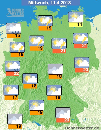 Am Mittwoch zeigen sich über der Südhälfte teils heitere Abschnitte, teils ziehen hier aber auch dichtere Wolken durch, dabei bleibt es trocken. Über der Nordhälfte ist es wechselnd bis stark bewölkt, dabei sind bevorzugt am Nachmittag zum Teil kräftige Schauer, örtlich auch Gewitter möglich. Die Temperatur steigt auf 11 Grad an der Ostsee und bis bis 23 Grad in der Lausitz.