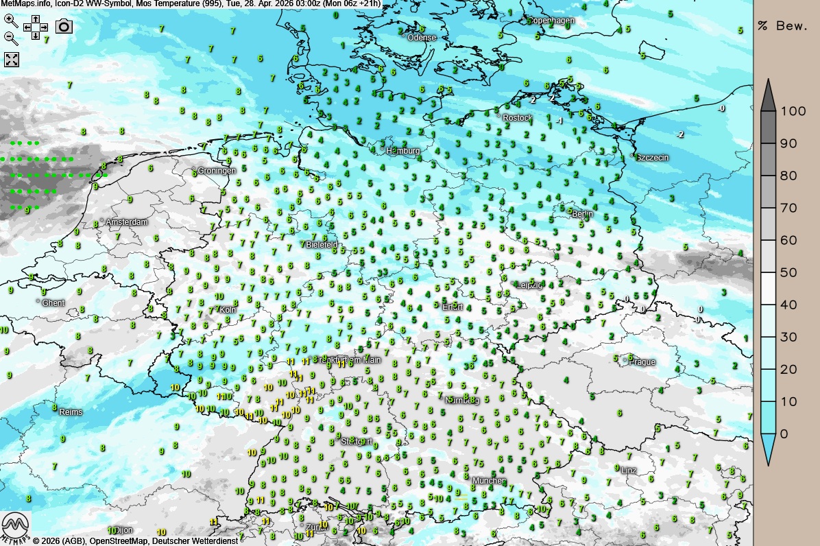 Die Wetter- / Temperaturkarte für Dienstagfrüh (03:00 Uhr) nach ICON-D2: