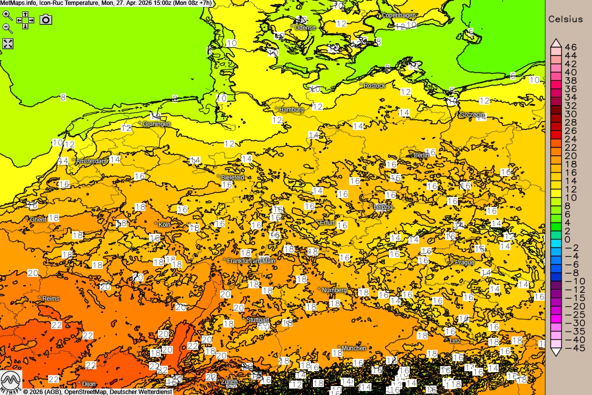 Die Höchstwerte liegen an den Küsten bei 10 °C, sonst steigen die Temperaturen im Norden auf 12 bis 16 °C. In den übrigen Landesteilen werden Temperaturen zwischen 17 und 23 °C, am Oberrhein lokal bis 24 °C erreicht.