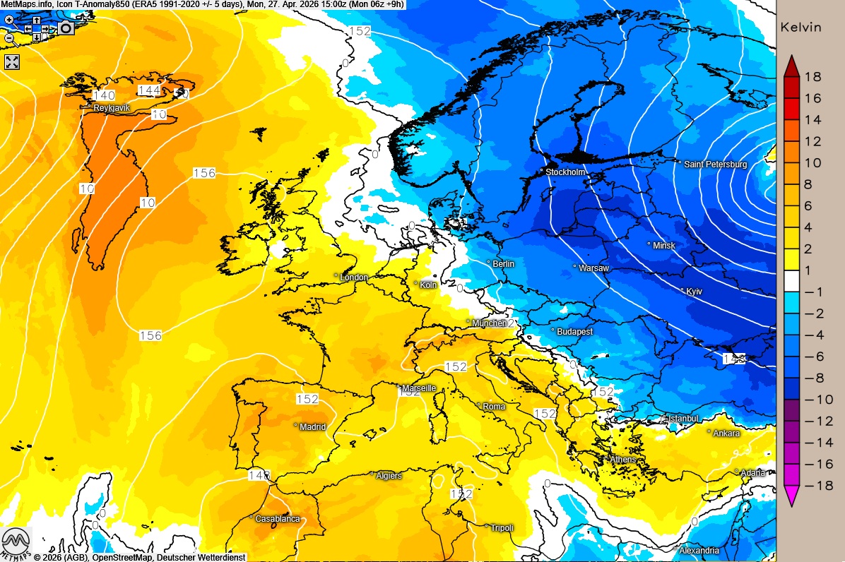Die Wetter- und Temperaturkarte für Montagnachmittag nach ICON-RUC sowie die Temperaturabweichung für 15:00 Uhr nach ICON: