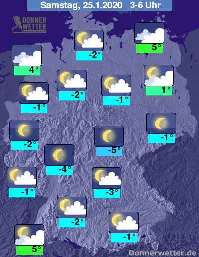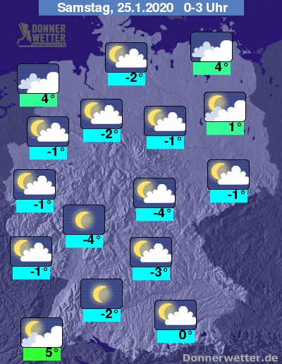 In der Nacht auf Samstag bleibt der Himmel an den Küsten, im Nordosten sowie am Oberrhein stark bewölkt oder bedeckt. In den übrigen Landesteilen ist es überwiegend locker bewölkt, es klart auf oder es bildet sich Nebel oder Hochnebel.