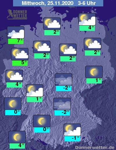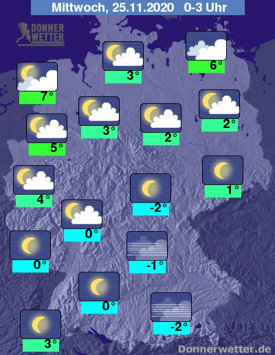Bis zu den Frühstunden kühlt die Luft auf 4 bis -2 Grad ab, in der Mitte und im Süden gibt es teilweise leichten Frost und die Gefahr von Reifglätte. Von der Kölner Bucht bis zur Nordsee bleibt es mit 7 bis 4 Grad etwas milder.