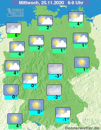Die Temperaturen erreichen in den Frühstunden Werte um -3 Grad an der Oberen Saale und um 6 Grad in Ostfriesland.