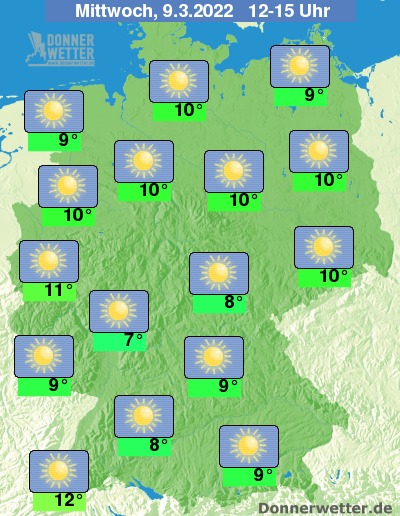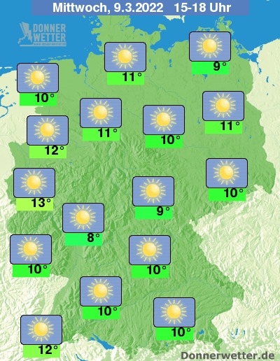 Die Temperaturen erreichen Werte um 8 Grad im Odenwald, 11 Grad entlang der Weser und 13 Grad im Rheinland.
