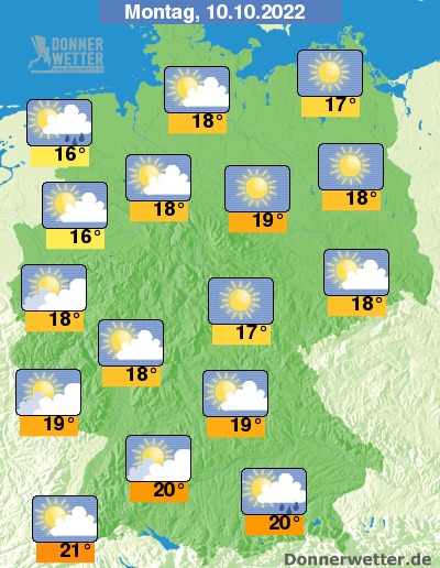 Am Montag bleibt es bis zum Abend über der Südosthälfte verbreitet heiter bis sonnig. Weiter nach Nordwesten hin ziehen dagegen von Westen her mehr und mehr Wolken herein, allerdings bleibt es noch trocken. Die Temperatur steigt auf 16 Grad an der Ems und bis 21 Grad am Oberrhein.