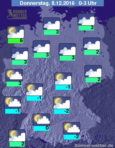 In der Nacht von Mittwoch auf Donnerstag im Norden bedeckt und mit 2 bis 6 Grad C relativ mild. In der Südhälfte teils leichte, teils stärkere Bewölkung bei kälteren Temperaturen von 2 bis minus 2 Grad C. Frost ist hier also möglich.