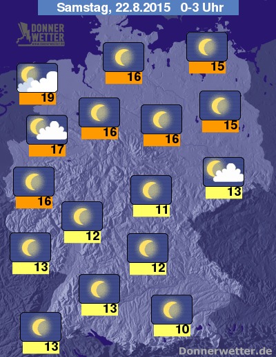 Im Laufe der späteren Nacht kühlt sich das Wetter ein bisschen ab, besodners im Südlichen Teil Deutschlands. Richtung Ostfrieland ziehen Wolken entlang, die den Himmel teilweise bedecken. Ansonsten wird es eine klare Nacht in den Samstag rein.