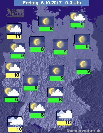 Die Temperaturen sinken im Nachtverlauf auf Werte um 11 Grad C in Ostfriesland und um 5 Gradf C in Franken.