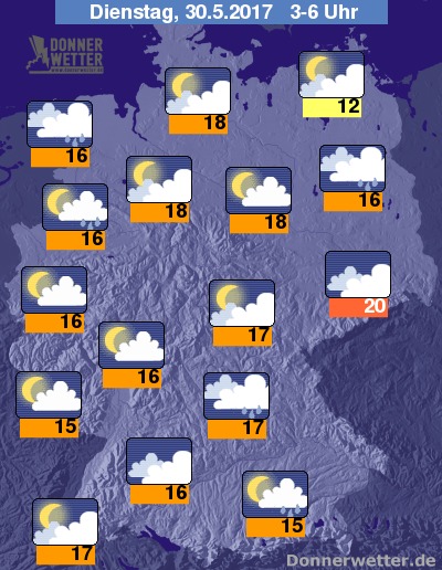 In der zweiten Nachthälfte sinkt das Unwetterrisiko insgesamt und vor allem über der Westhälfte lockert der Himmel häufig auf. Besonders über der Osthälfte bleibt es aber bis zum Morgen weiterhin stark bewölkt und es sind gebietsweise Schauer und einzelne Gewitter möglich. Die Temperatur sinkt auf tropische 20 Grad in Dresden und etwa 12 Grad in Rostock.