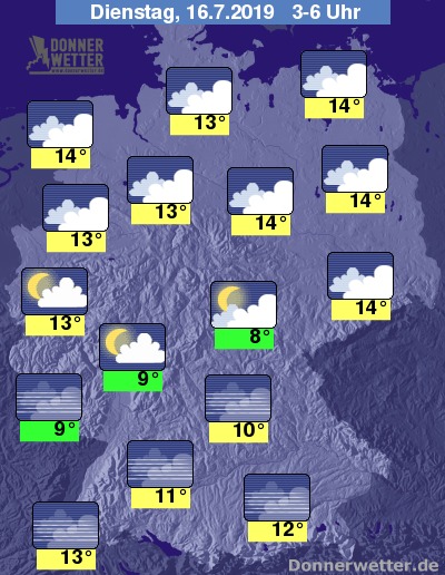 Der Himmel über Deutschland zeigt sich in der Nacht überwiegend bedeckt, aber es bleibt trocken. Zudem kann es vor allem im Süden nebelig werden. Die Temperaturen sinken bis auf 14 Grad in Dresden und 8 Grad im Thüringer Land.