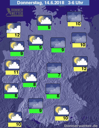 In der Nacht zum Donnerstag klart der Himmel über weiten Landesteilen auf, oft noch leicht bewölkt ist es entlang des Rheins, der Ems, sowie am Alpenrand und am Erzgebirge, dazu bleibt es trocken. Die Temperatur sinkt auf 12 Grad in Dresden und bis 7 Grad im Grabfeld.