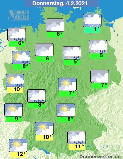 Am Donnerstag fällt im Norden und Osten unter dichten Wolken anfangs noch gebietsweise Schnee, zum Teil auch Schneeregen oder Regen. Im übrigen Bundesgebiet ist es oft stark, teils auch aufgelockert bewölkt, dazu fällt nur vereinzelt etwas Regen. Die Temperatur steigt auf 1 Grad in Rostock und bis 12 Grad in Freiburg.