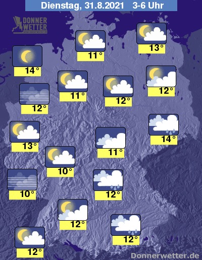 In der Nacht zum Dienstag bilden sich über Bayern und Sachsen weiterhin gebietsweise Schauer und die Wolkendecke bleibt hier weitgehend geschlossen. Weiter nach Nordwesten hin, in einem breiten Streifen von Südwest- bis nach Nordostdeutschland zeigt sich der Himmel locker bis aufgelockert bewölkt. Hier bleibt es auch schon trocken, noch weiter nach Nordwesten hin ist es sogar oft sternenklar oder nur locker bewölkt, dazu bleibt es ebenfalls trocken. Die Temperatur sinkt auf 14 Grad in Dresden und bis 10 Grad in Saarbrücken.