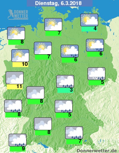 Am Dienstag scheint im Norden häufig Sonne und es ist hier weitgehend trocken, im Süden und Osten ziehen dagegen im Tagesverlauf dichte Wolken mit Schnee oder Regen auf. Im übrigen Land ist es oft stark, teils aufgelockert bewölkt, dazu jedoch meist trocken. Die Temperatur steigt auf 4 bis 11 Grad.