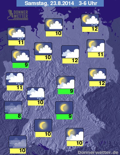 In der kommenden Nacht fallen die Schauer im Westen und Norden meist in sich zusammen, bei teils dichten Wolken ist jedoch hier und da auch etwas Regen möglich. Nach Osten hin bleibt es bei aufgelockerter Bewölkung weitgehend trocken und im Süden wird es sogar verbreitet sternenklar und es bleibt ebenfalls weitgehend trocken. Die Temperatur sinkt auf 12 Grad an der Mecklenburger Seenplatte und etwa 8 Grad im Saargau.