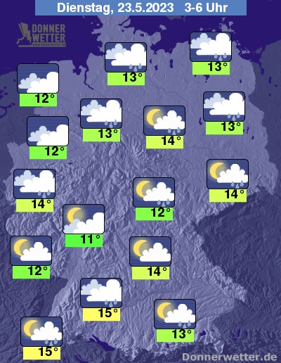 In der Nacht zum Dienstag bleibt es teils stark, teils aufgelockert bewölkt. Vor allem bis Mitternacht sind dabei lokal weitere Schauer und Gewitter möglich, die bis zum Morgen aber seltener werden. Die Temperatur sinkt auf 15 Grad an der Schwäbischen Alb und 11 Grad am Westerwald.
