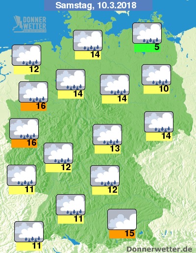 In der Nacht zum Samstag halten sich verbreitet dichte Wolken, dazu bleibt es im Alpenvorland und im Nordosten des Landes trocken, sonst fällt hingegen zeitweise Regen. Die Temperatur sinkt auf 9 Grad im Breisgau und bis 0 Grad in Vorpommern.