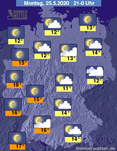 Am Abend zeigt sich der Himmel zunächst noch verbreitet wechselnd oder stark bewölkt, vor allem an den Küsten sowie in der Westhälfte kann es gebietsweise auch mal heiter sein. Im Osten und im Alpenvorland kann gebietsweise etwas Regen fallen, sonst bleibt es überwiegend trocken.