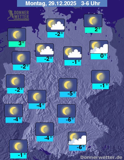 In der Nacht zum Montag ziehen im Osten und Norden gebietsweise dichte Wolken durch, es bleibt hier aber von seltenen Tropfen abgesehen weitgehend trocken. Im großen Rest der Republik ist der Himmel überwiegend sternenklar und es bleibt komplett trocken. Die Tiefstwerte liegen bei 3 Grad in Wilhelmshaven und bis -6 Grad in Nürnberg.