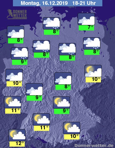 Am Abend bleibt der Himmel über dem Norden des Landes bedeckt und zeitweise fällt Regen, der in den späten Abendstunden aber zunehmend abschwächt. Im Süden ist es in den nächsten Stunden überwiegend locker oder aufgelockert bewölkt und es bleibt trocken.