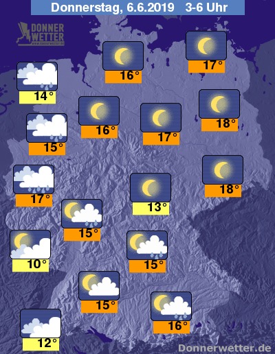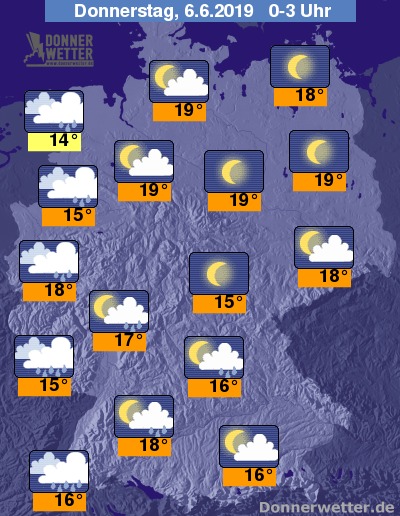 In der Nacht ist der Himmel entlang des Rheins meist dicht bewölkt oder bedeckt und immer wieder fallen Niederschläge. Im Süden sind bei zumeist lockerer Bewölkung ebenfalls zeitweise Schauer zu erwarten. Im Norden und Osten bleibt es bei lockeren Wolken, häufig auch sternenklarem Himmel, meist trocken.