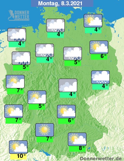 Am Montag bleibt die Wolkendecke von der Nordseeküste bis ins Erzgebirge zumeist geschlossen und immer wieder muss im Tagesverlauf mit Regen-, Schneeregen- oder Schneeschauern gerechnet werden. Im Süden Deutschlands zeigt sich der Himmel dagegen teils heiter bis wolkig, teils scheint die Sonne von einem wolkenlosen Himmel und es bleibt trocken.