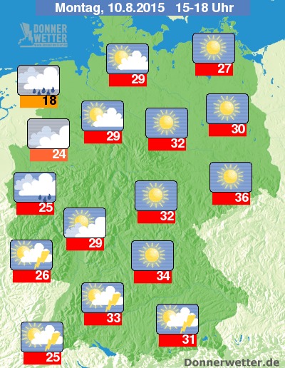 Heute Nachmittag ist es über der Osthälfte von Deutschland größtenteils sonnig und trocken. Besonders in den westlichen Landesteilen sowie im Süden der Republik ziehen hingegen oft dichte Wolken auf und es können sich kräftige Schauer und zum Teil schwere Gewitter entwickeln. Die Temperatur steigt auf kühle 18 Grad an der Nordsee und auf heiße 36 Grad in Dresden.