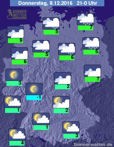 In der ersten Nachthälfte hält der Regen im Norden an, während vor allem entlang von Rhein und Donau die Sterne funkeln. Unter klarem Himmel fallen die Temperaturen auf Tiefstwerte um den Gefrierpunkt. Deutlich milder bleibt es in Küstennähe mit Werten deutlich über 5 Grad.