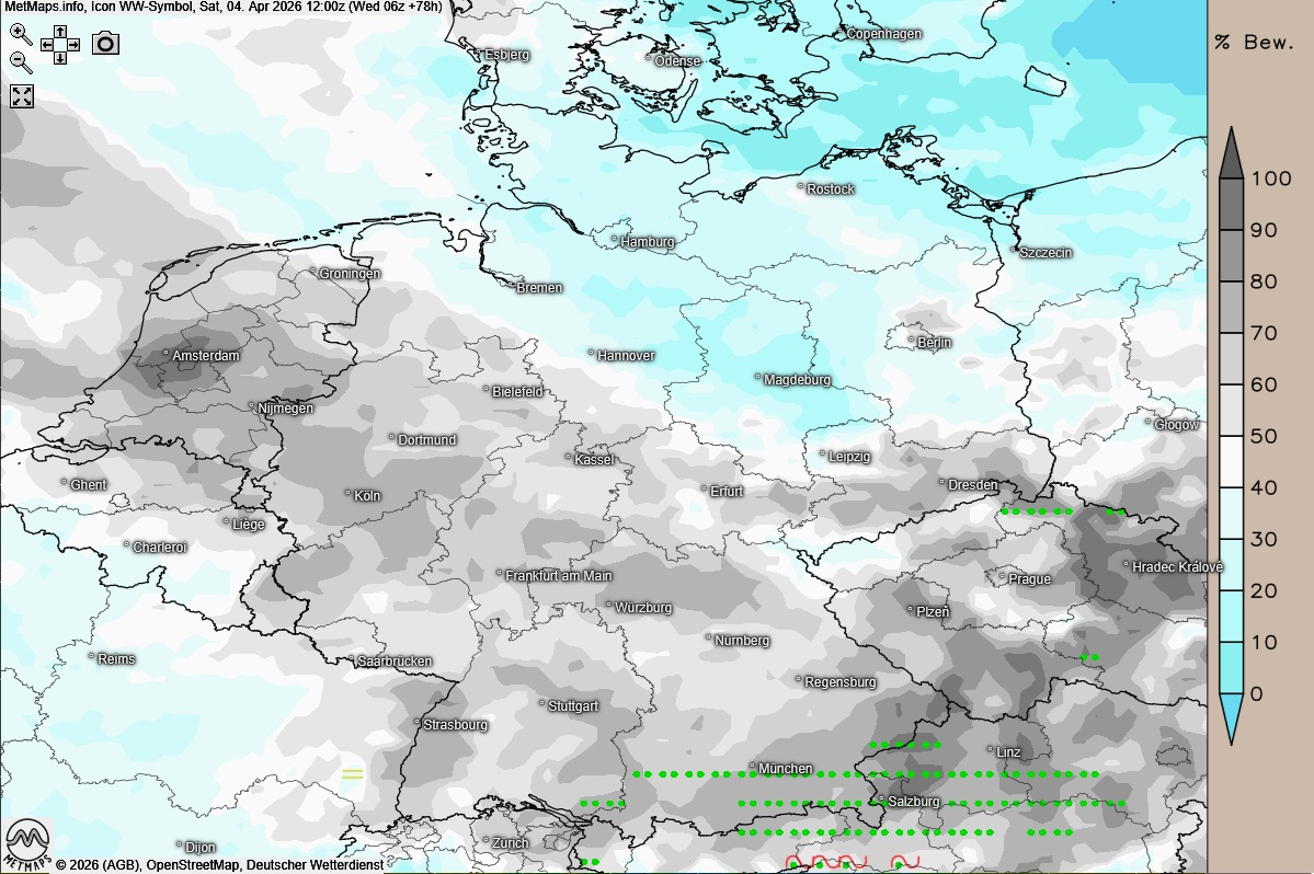 An Karfreitag zunächst bei wechselnder Bewölkung trocken. Im Westen und Nordwesten im Tagesverlauf Wolkenverdichtung, zum Abend zeitweise Regen. Höchstwerte um 9 bis 15 Grad.