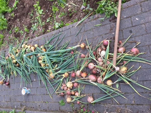 Nach der Pflanzung der Zwiebeln im April sind die Lauchgewächse, nach Abknicken und Eintrocknen des Laubs, ab August lagerfähig. Bevor es aber ins Lager geht, sollte die Pflanze, wie auf unserem Bild, noch einige Tage zum Trocknen ausgelegt und regelmäßig gedreht werden. So trocknen die äußeren Schichten der Zwiebel ab und die Haltbarkeit im Lager wird verlängert.